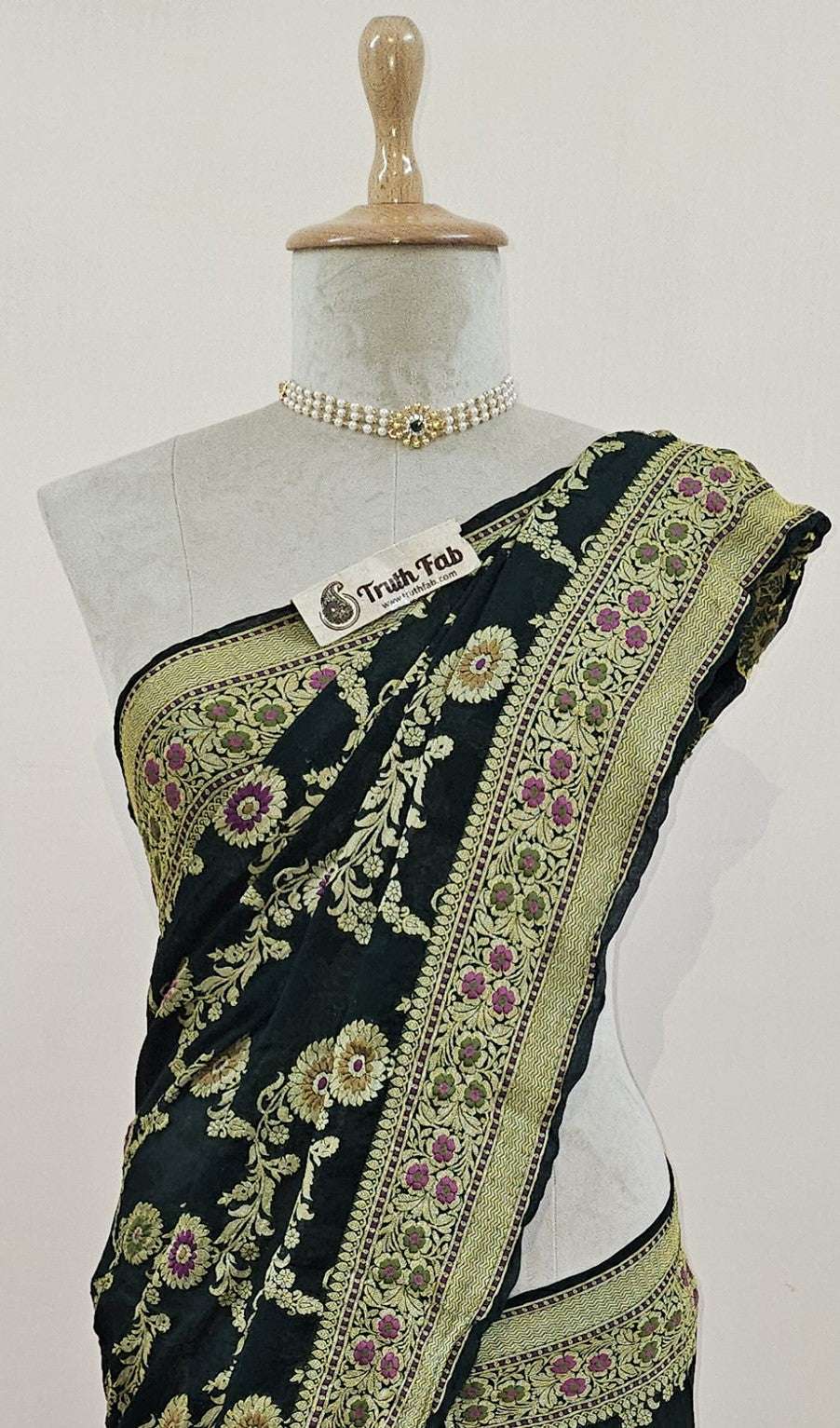 Pure banarasi handloom chiffon meenakari saree with meenakari design in black color. Saree has a delicate chiffon meenakari zari border with Gorgeous unique Motifs near pallu. It is an elegant traditional Banarasi saree. Irresistible wedding collection. This Mesmerising Saree is a Combination of Elegance and Style.