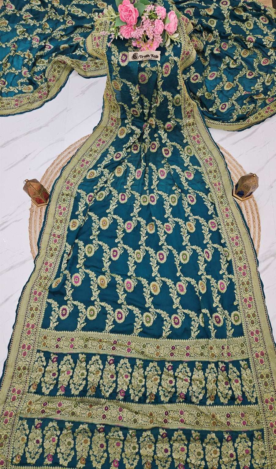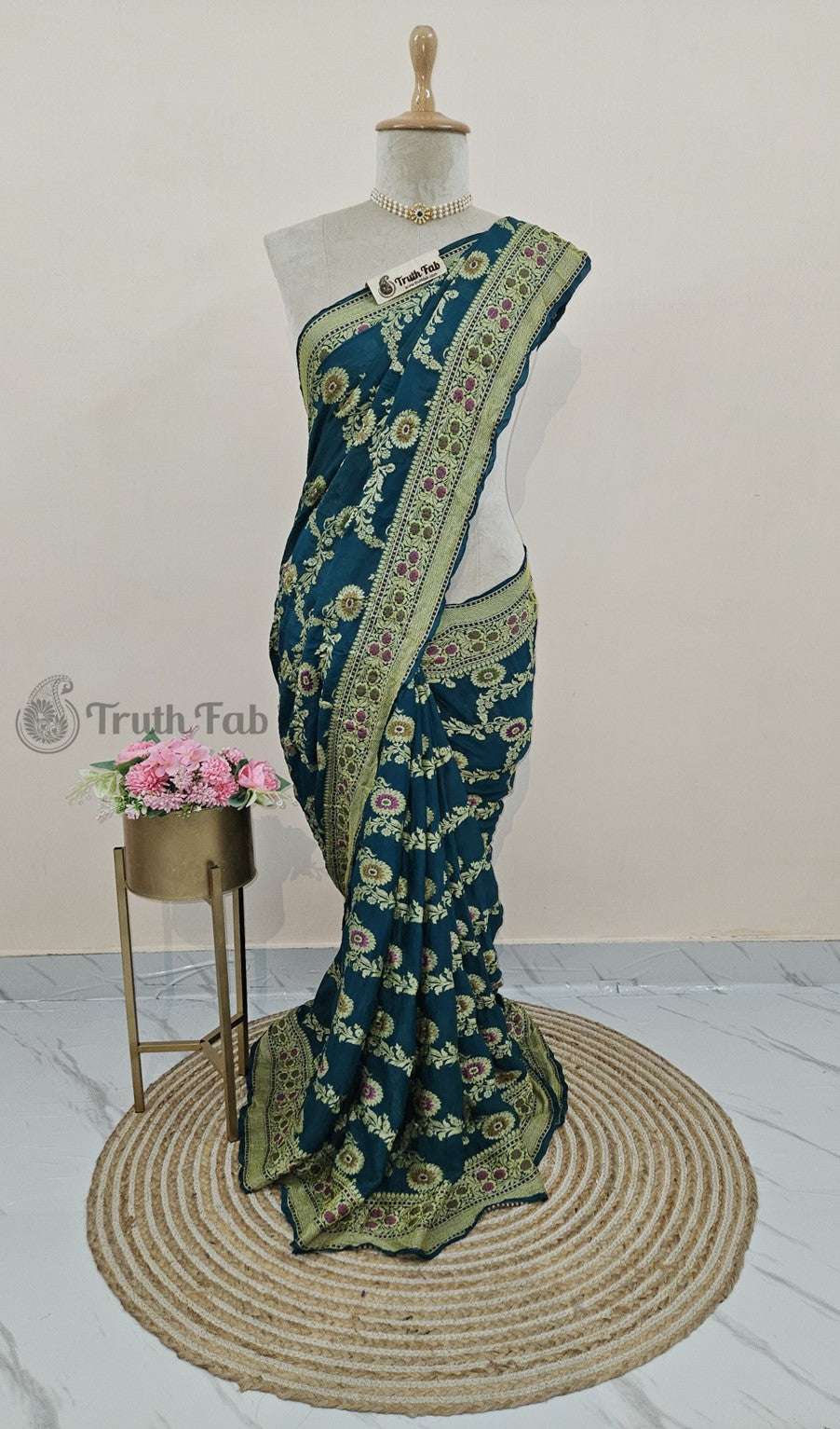 Teal Blue Pure Banarasi Handloom Khaddi Chiffon Meenakari Zari Design Saree