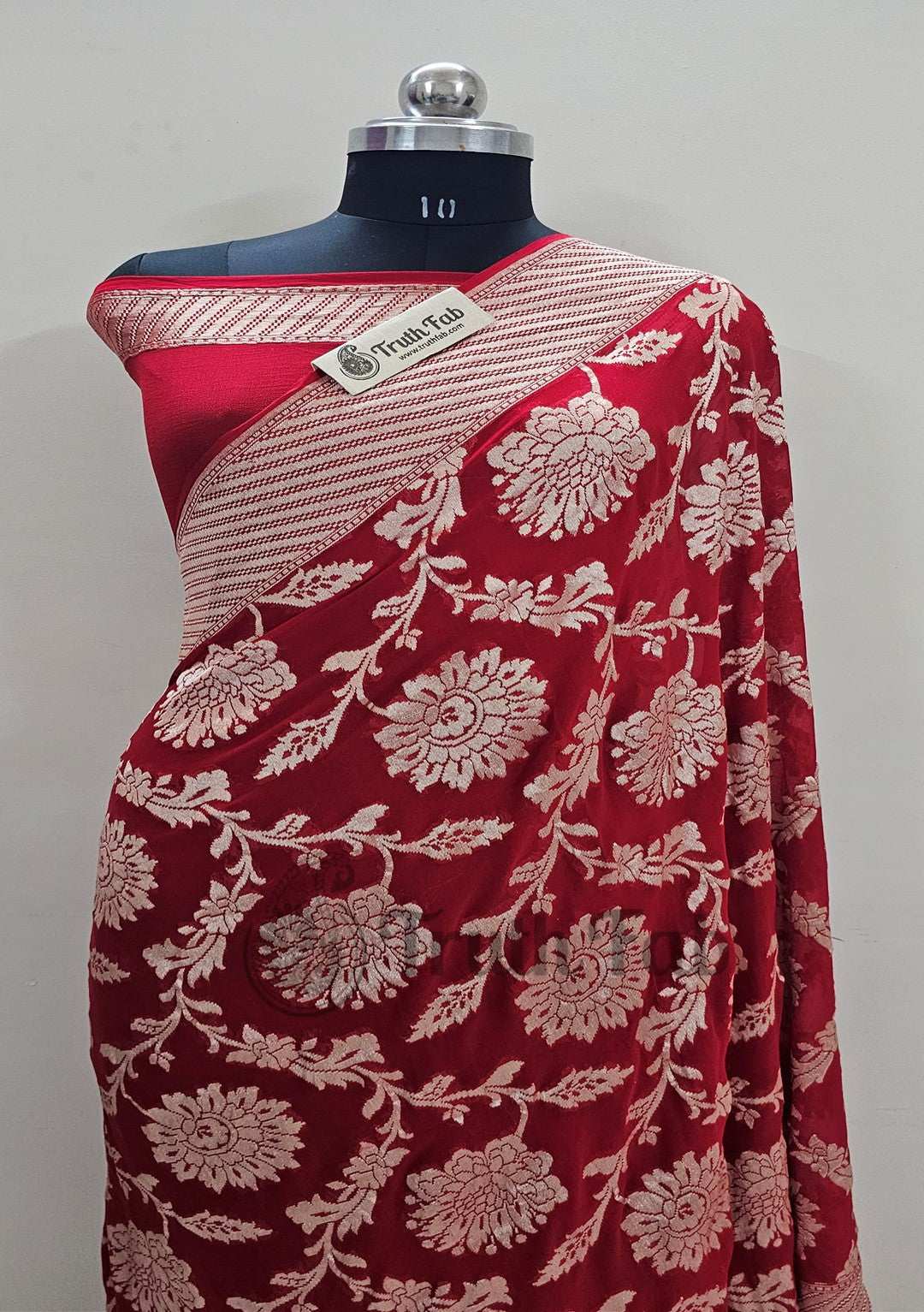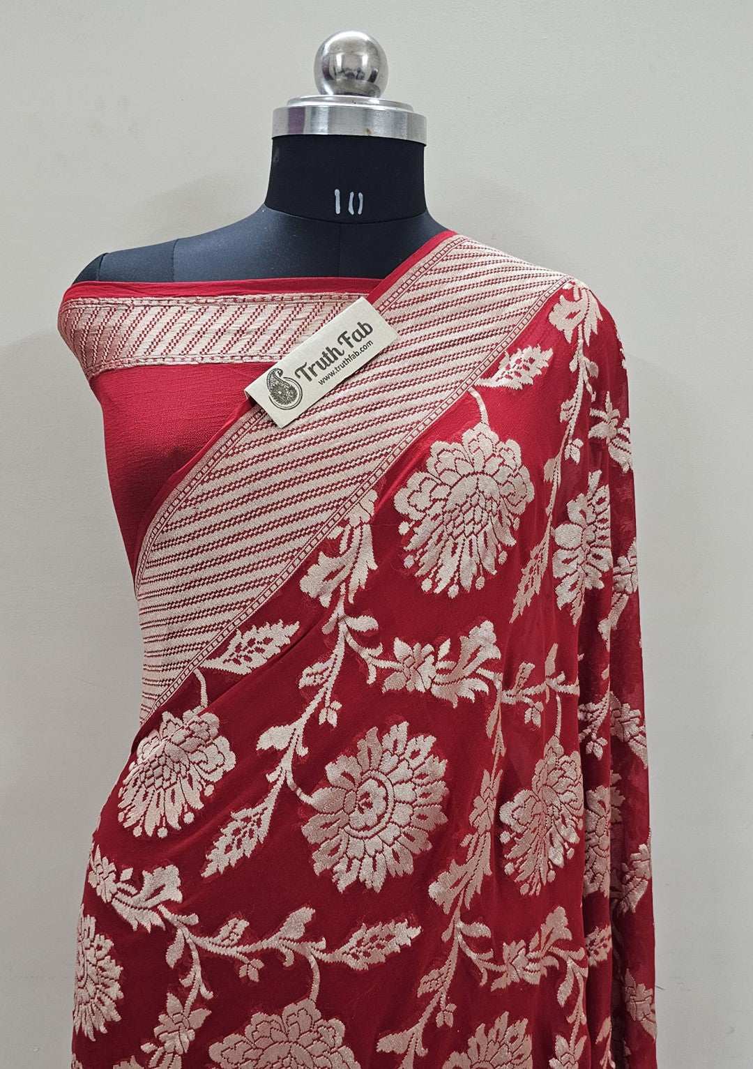Design Detail: Pure Khaddi Georgette Handloom Banarasi Saree Weaving a permanent handloom. The elaborate and laborious technique involves hand-weaving each separately. This takes longer on the handloom but creates a more robust pattern, which stands on the fabric.