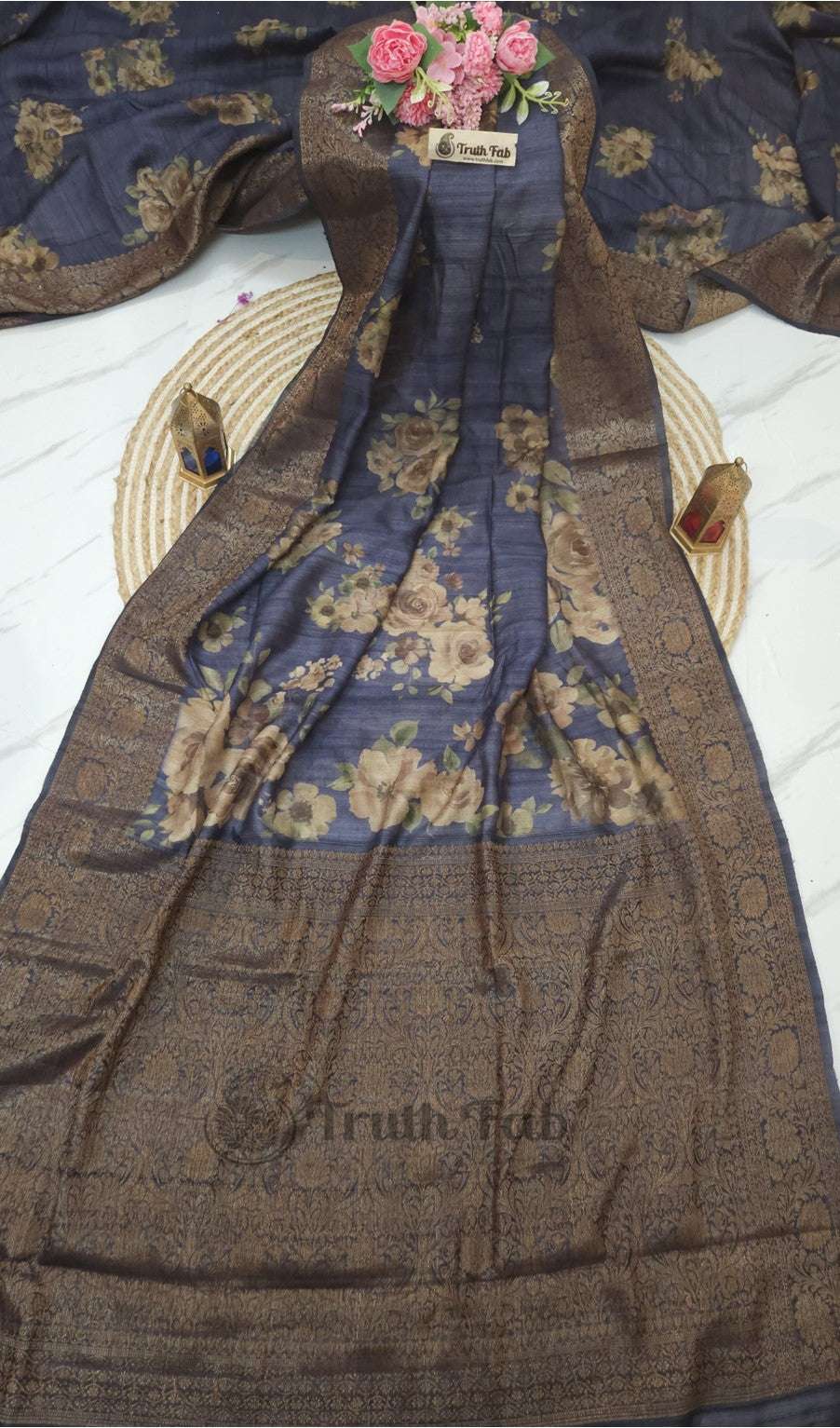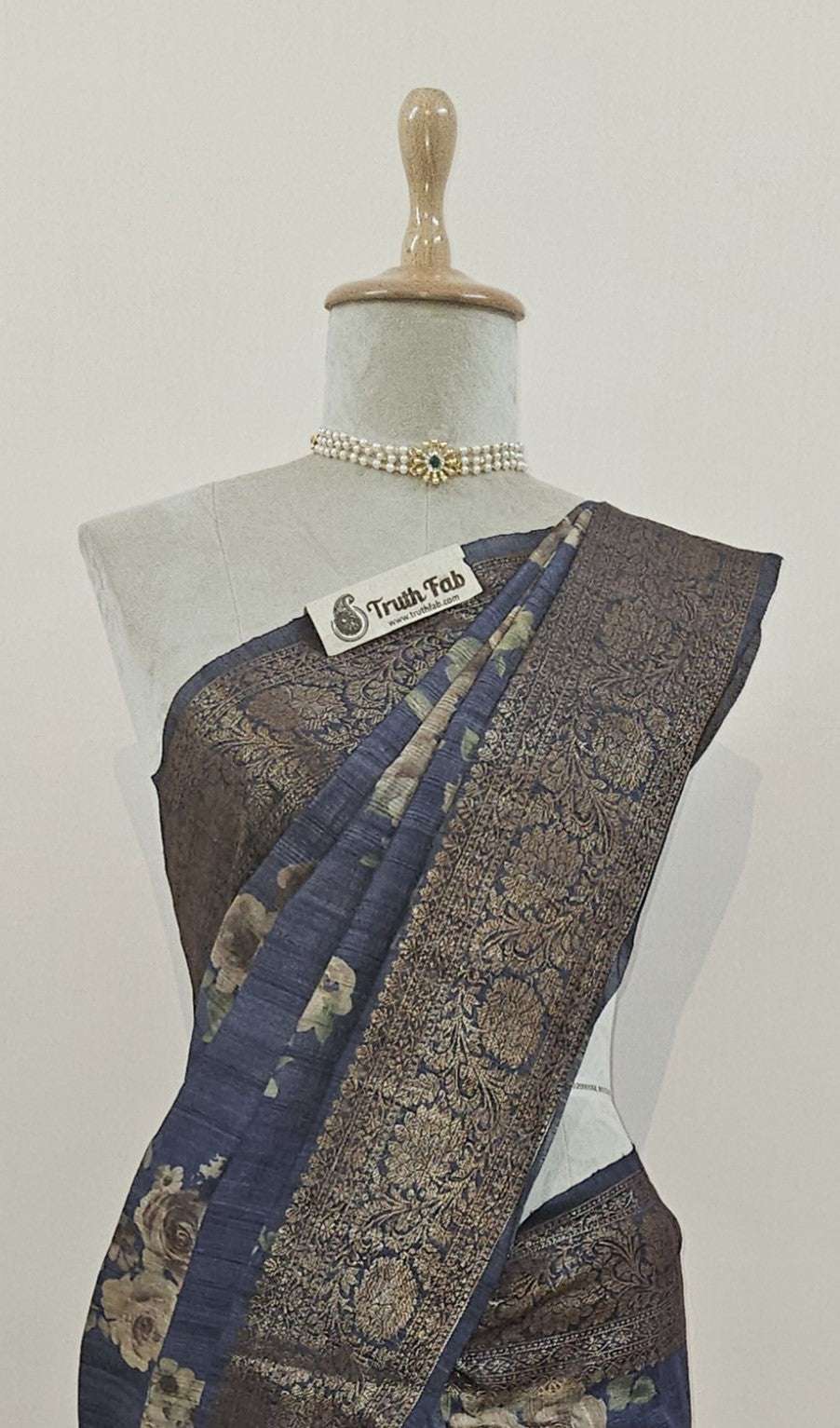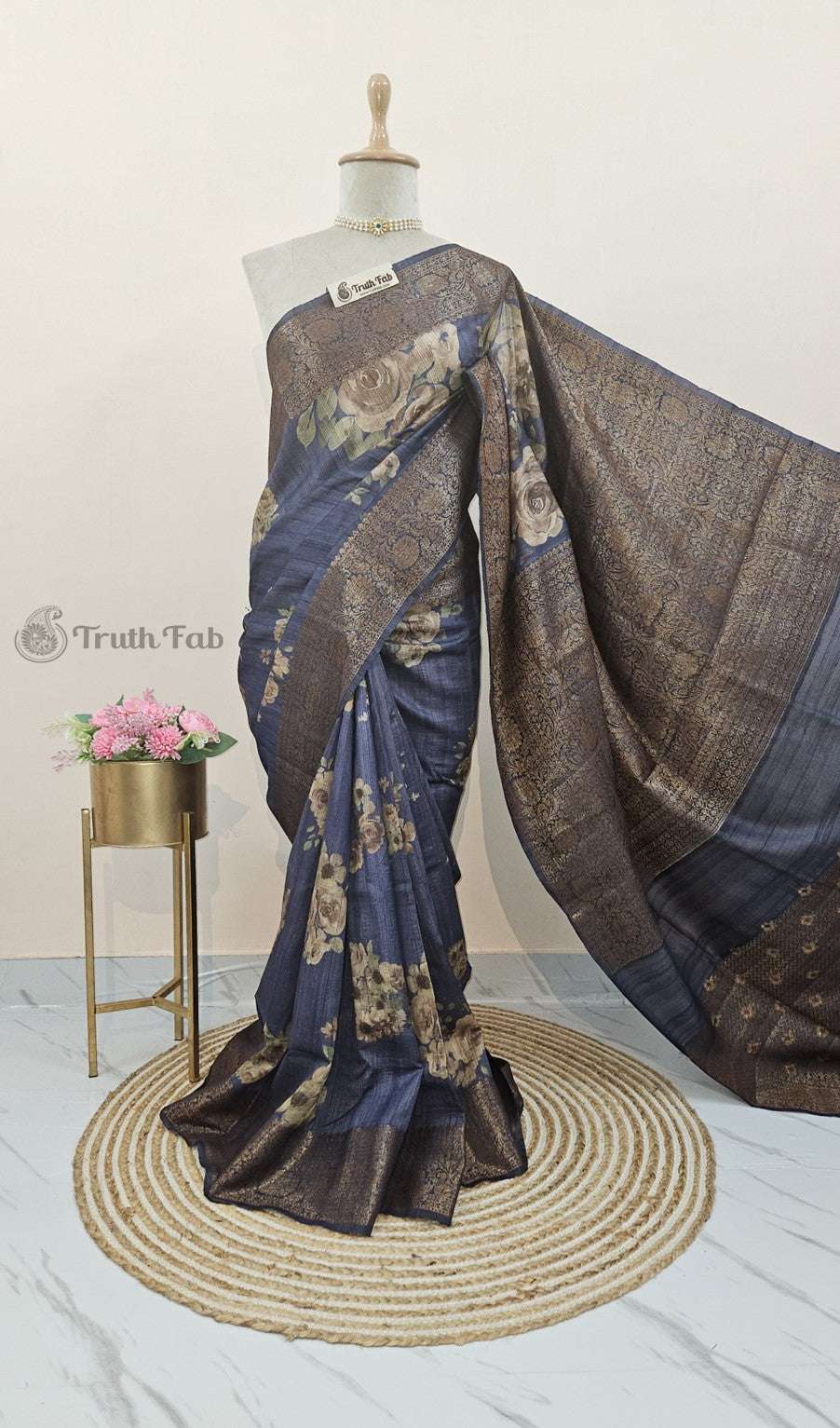 Blue Color Pure Banarasi Handloom Tussar Georgette Saree- Digital Print Design