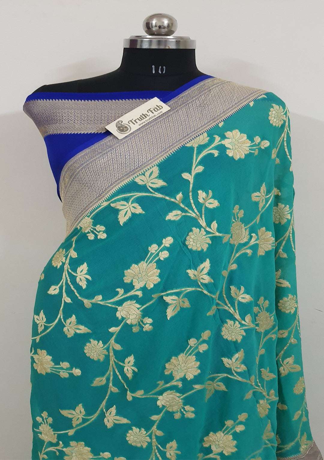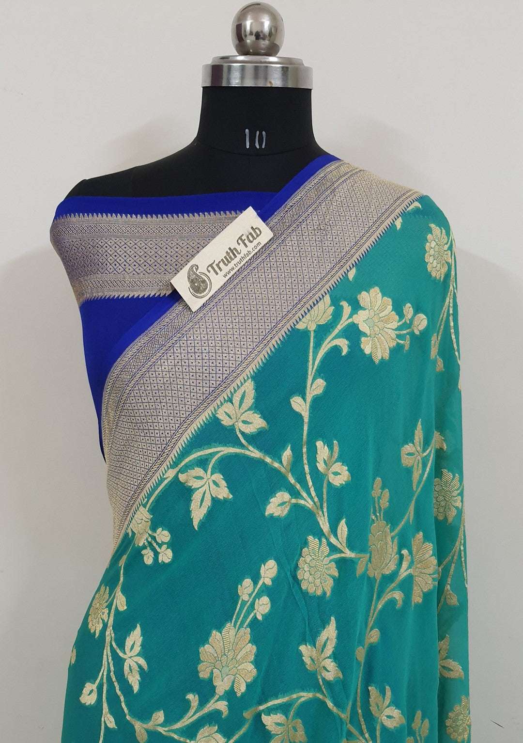 Design Detail: Pure Khaddi Georgette Handloom Banarasi Saree Weaving a permanent handloom. The elaborate and laborious technique involves hand-weaving each separately. This takes longer on the handloom but creates a more robust pattern, which stands on the fabric.