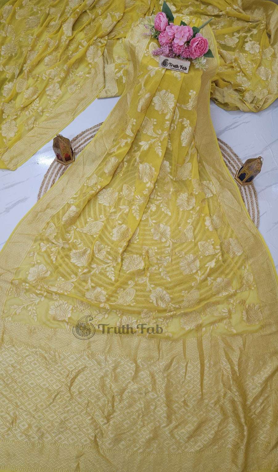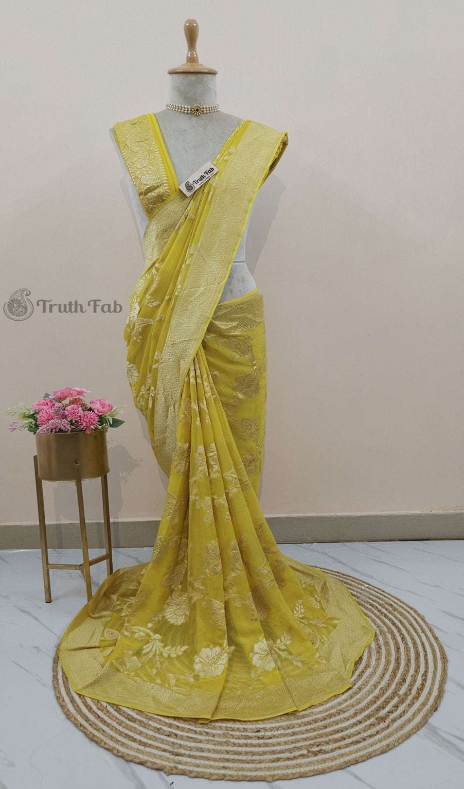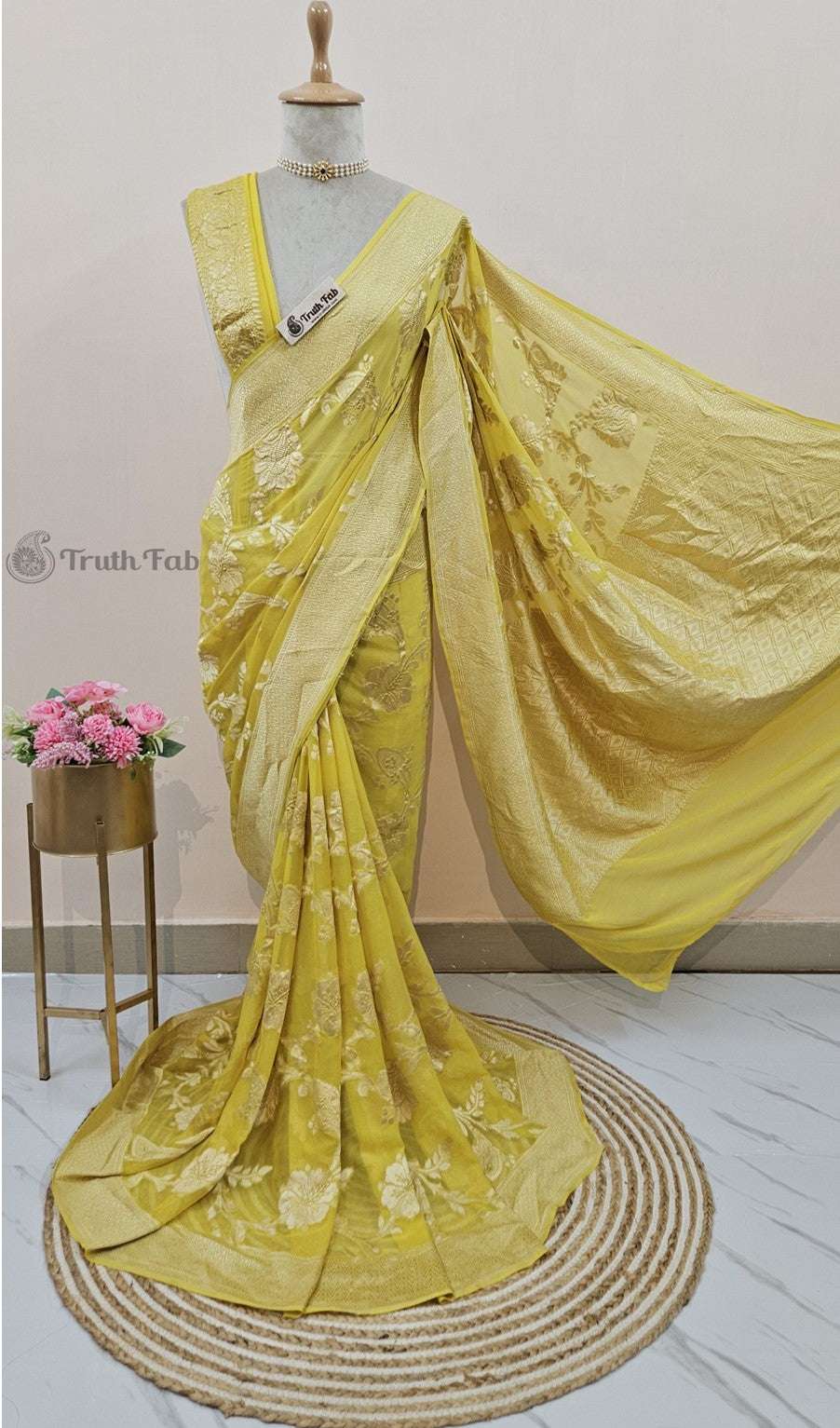 Design Detail: Pure Khaddi Georgette Handloom Banarasi Saree Weaving a permanent handloom. The elaborate and laborious technique involves hand-weaving each separately. This takes longer on the handloom but creates a more robust pattern, which stands on the fabric.