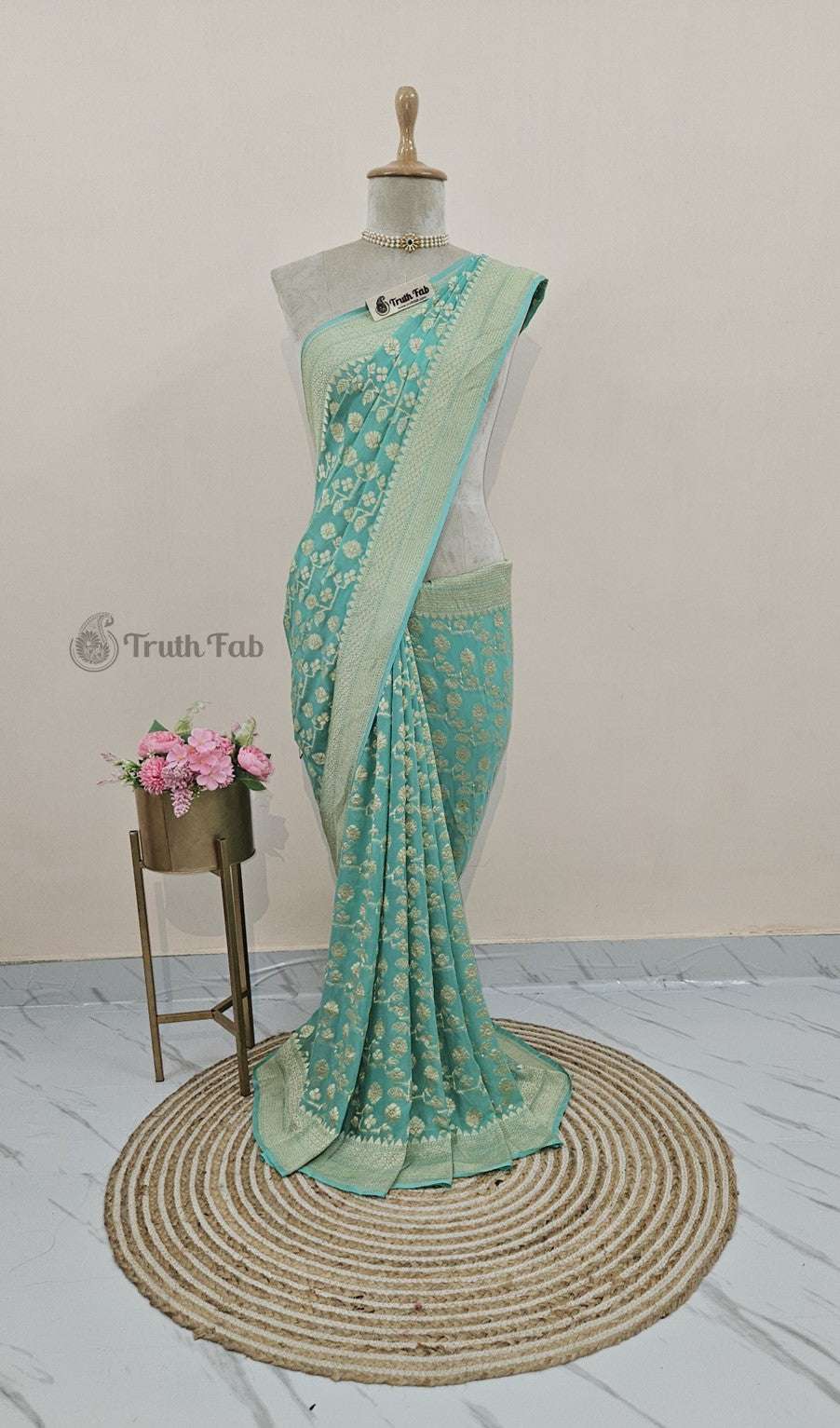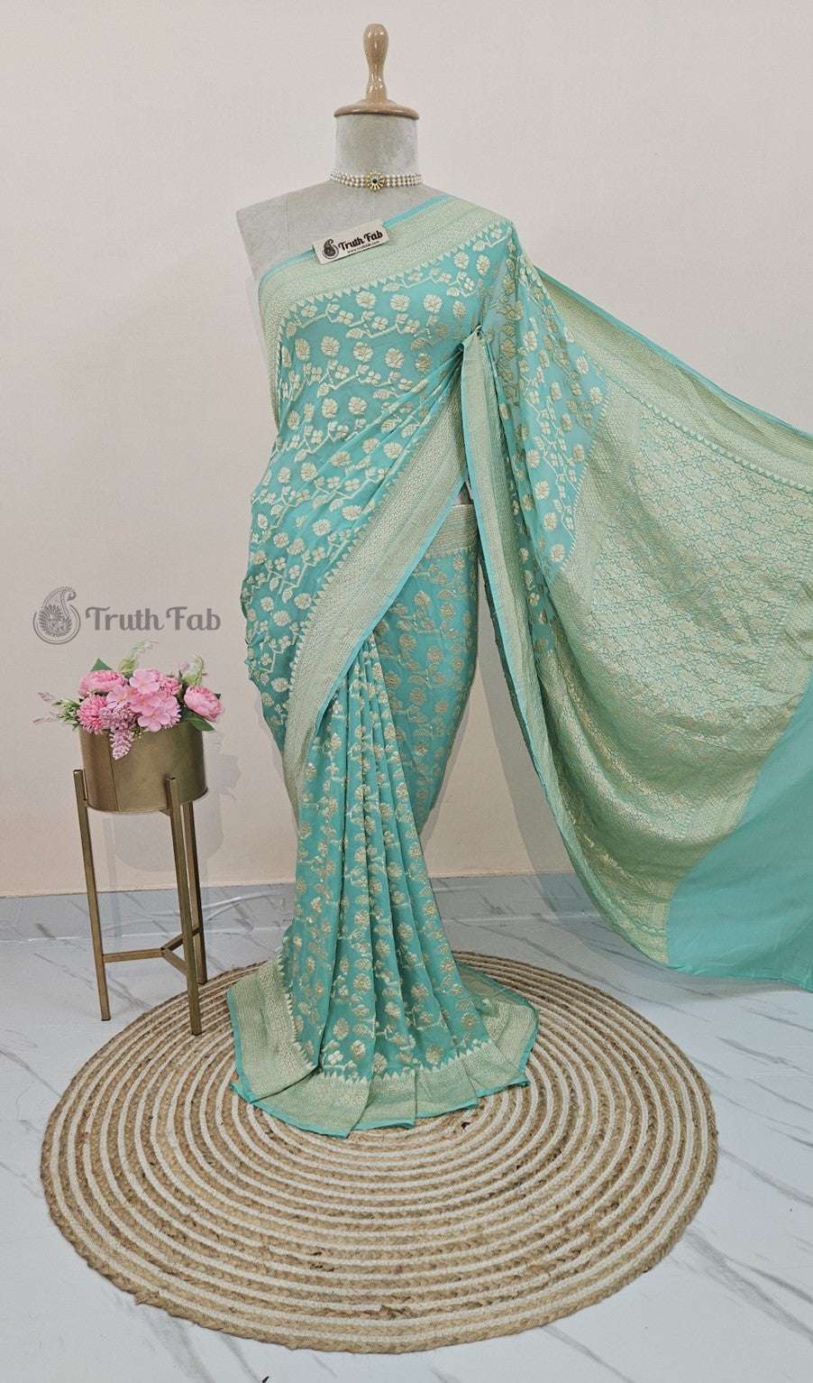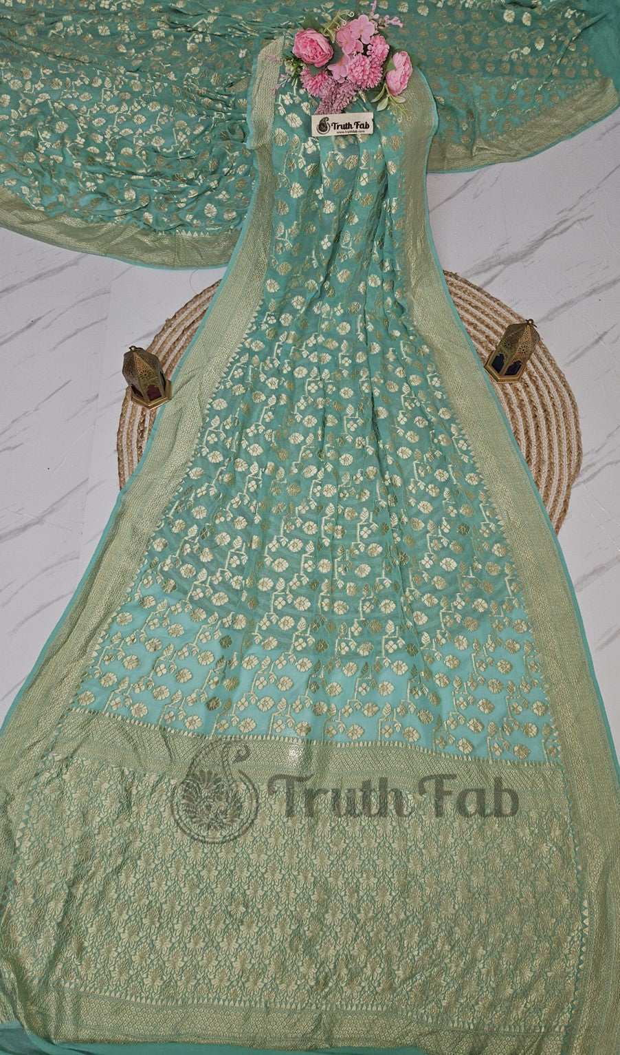 Design Detail: Pure Khaddi Georgette Handloom Banarasi Saree Weaving a permanent handloom. The elaborate and laborious technique involves hand-weaving each separately. This takes longer on the handloom but creates a more robust pattern, which stands on the fabric.