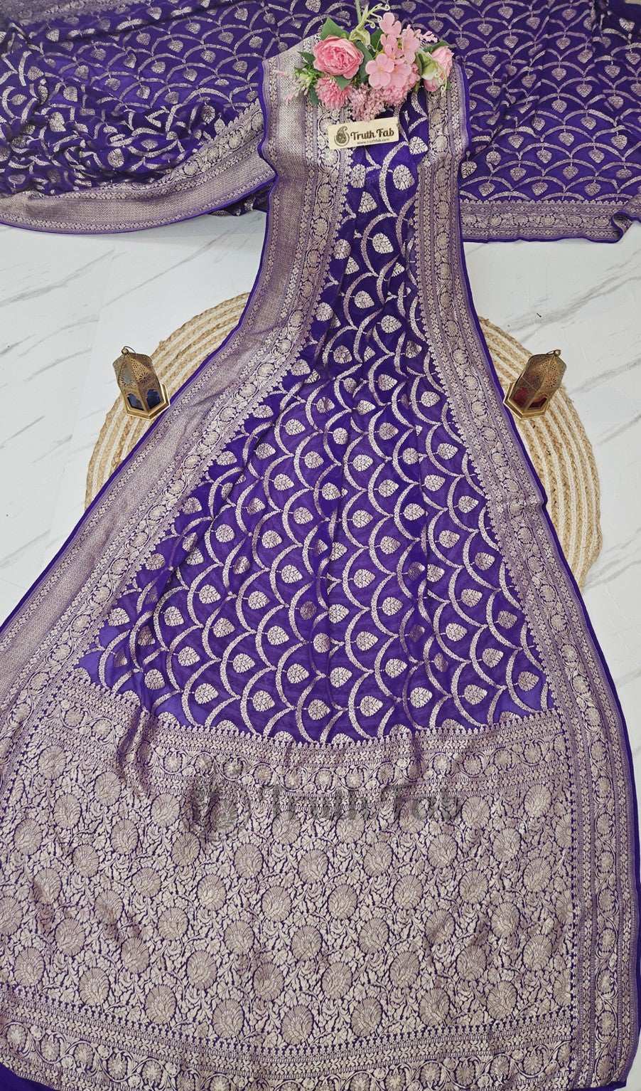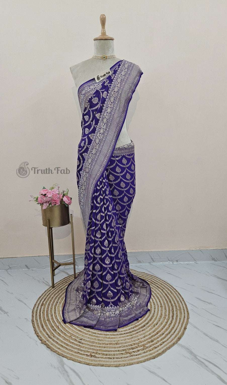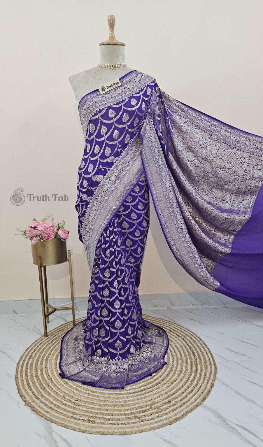 Design Detail: Pure Khaddi Georgette Handloom Banarasi Saree Weaving a permanent handloom. The elaborate and laborious technique involves hand-weaving each separately. This takes longer on the handloom but creates a more robust pattern, which stands on the fabric.