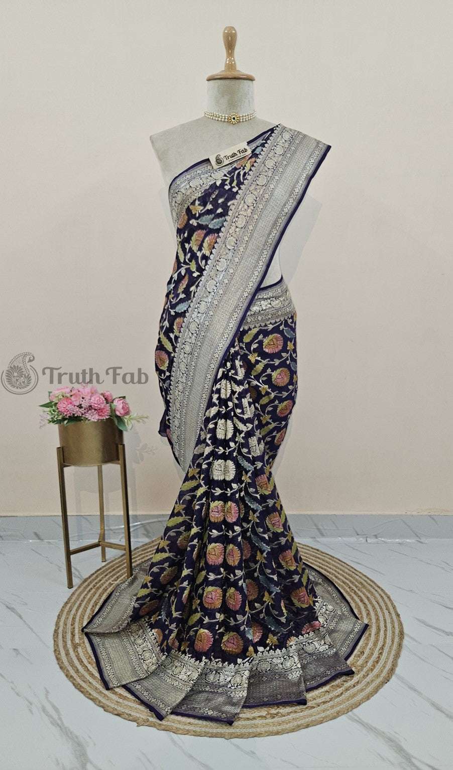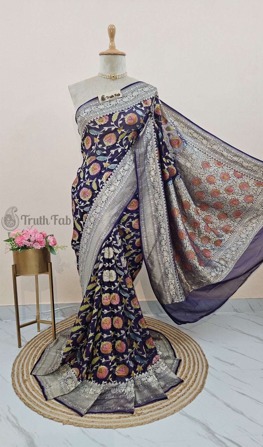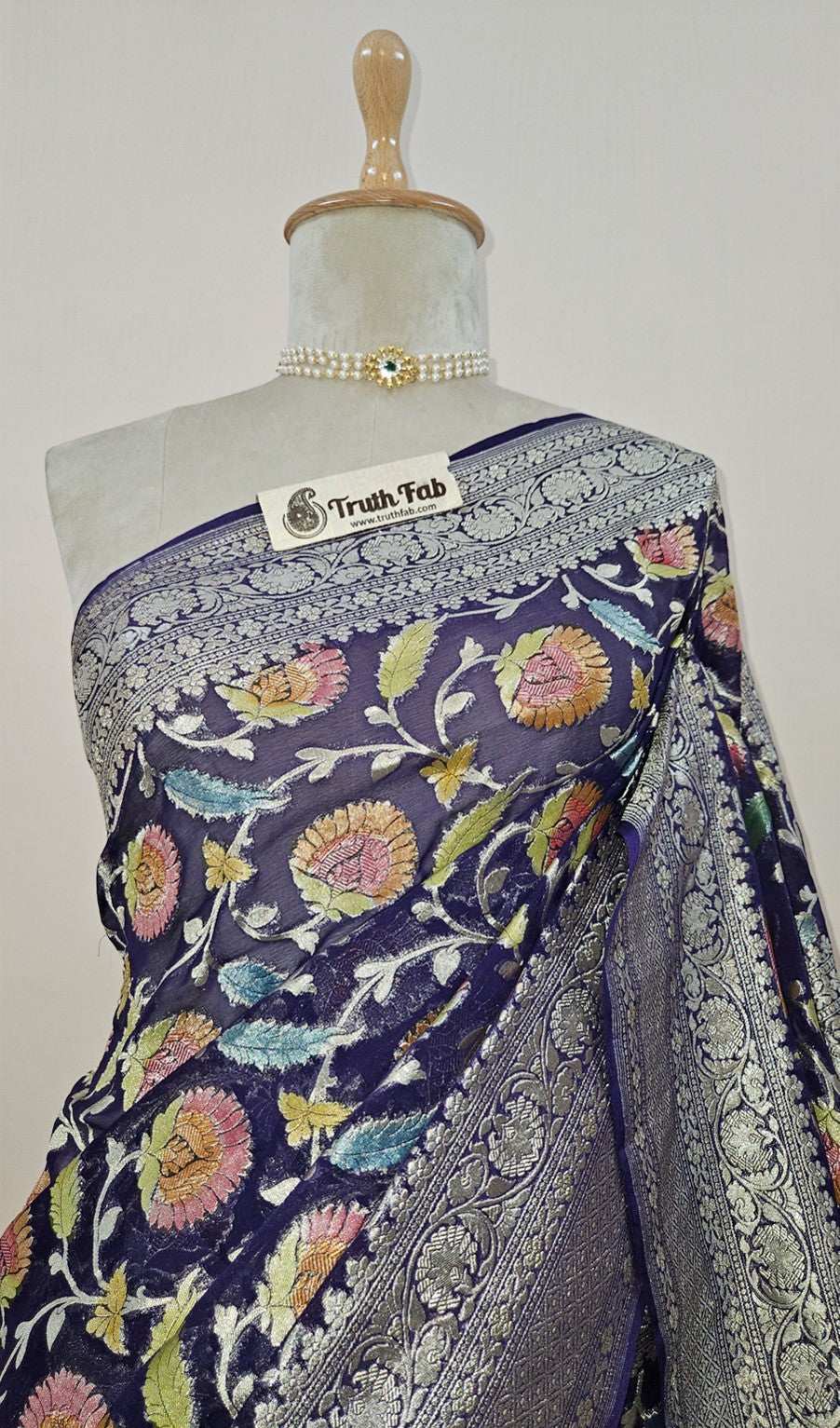 Design Detail: Pure Khaddi Georgette Handloom Banarasi Saree Weaving a permanent handloom. The elaborate and laborious technique involves hand-weaving each separately. This takes longer on the handloom but creates a more robust pattern, which stands on the fabric.