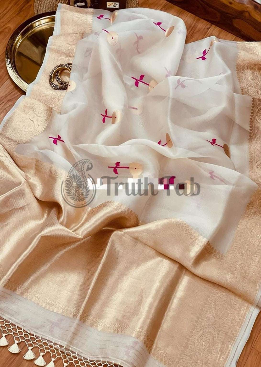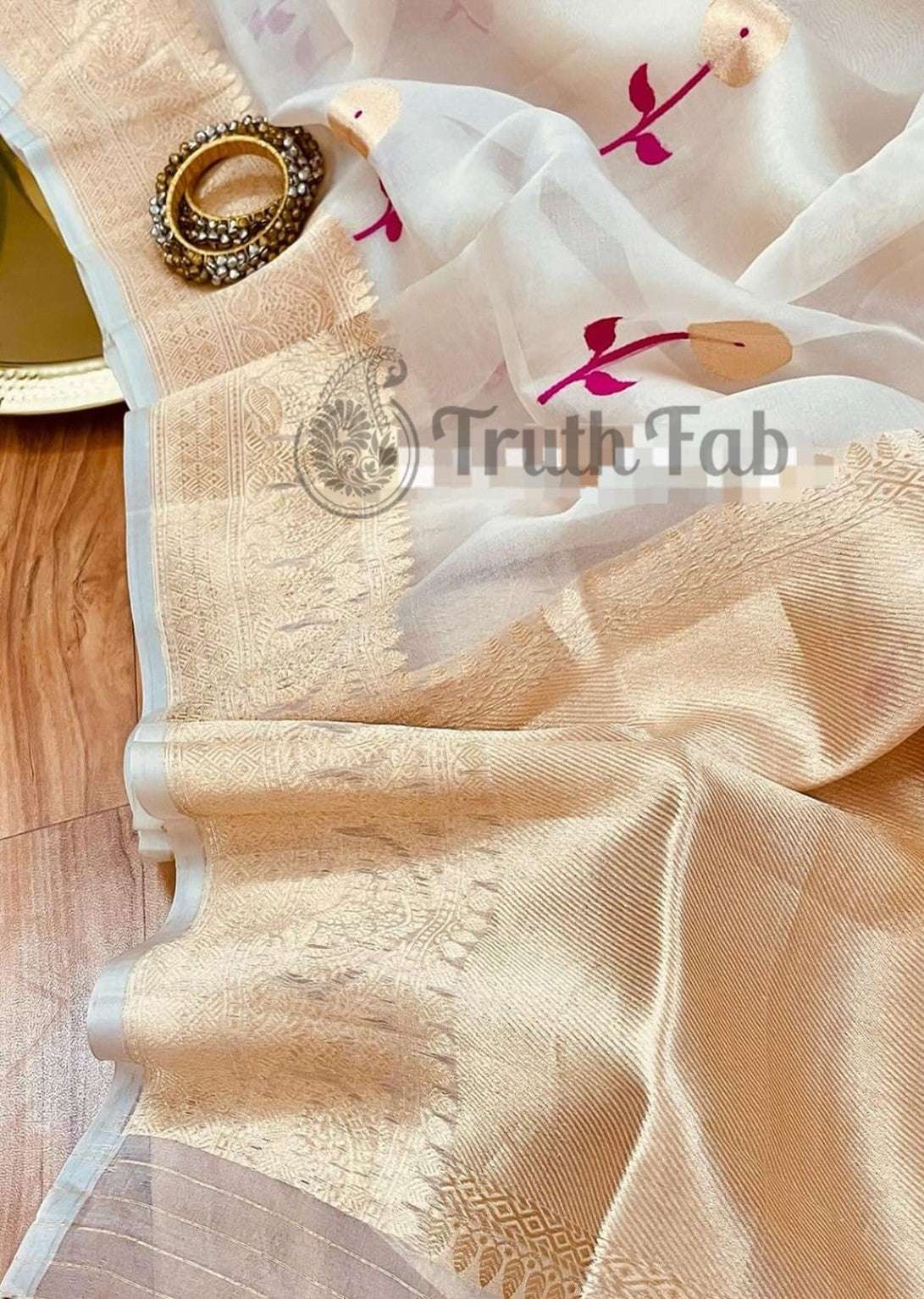 White Pure Banarasi Handloom Kora Silk Meenakari Saree