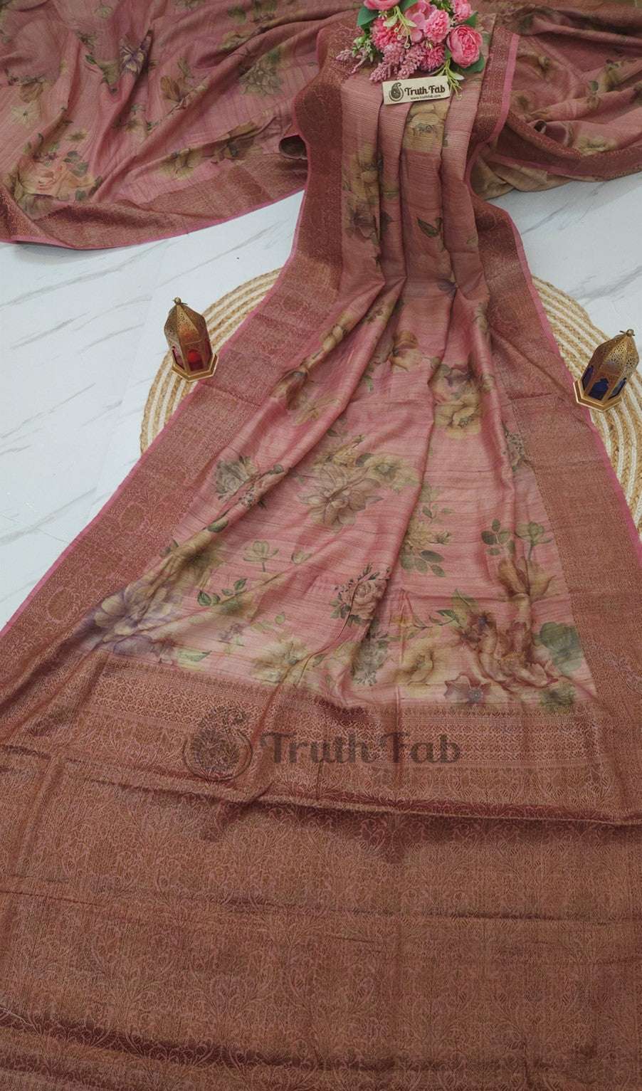 Rose Pink Pure Banarasi Handloom Tussar Georgette Saree- Digital Print Design