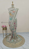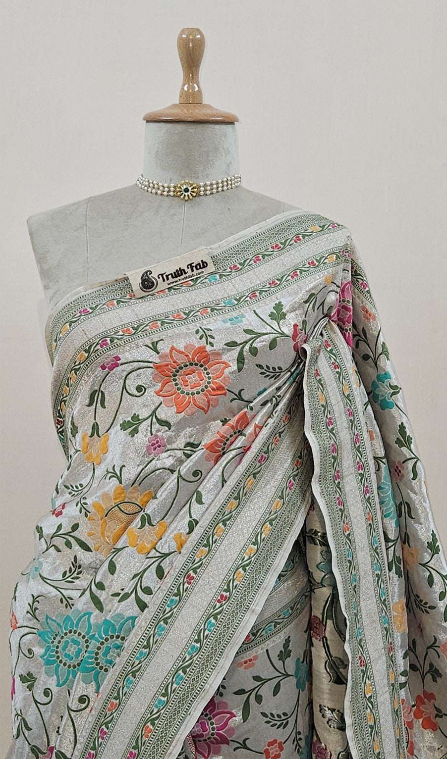 Design Detail: Pure tussar Georgette Handloom Banarasi Saree Weaving  permanent handloom. The elaborate and laborious technique involves hand-weaving each separately. This takes longer on the handloom but creates a more robust pattern, which stands on the fabric.