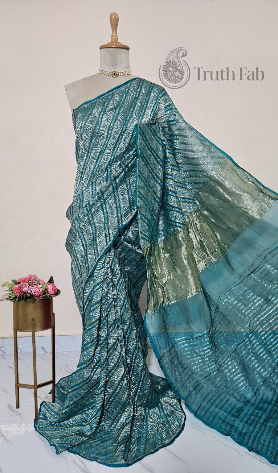 Teal Blue Pure Banarasi Handloom Crush Tissue Silk Saree